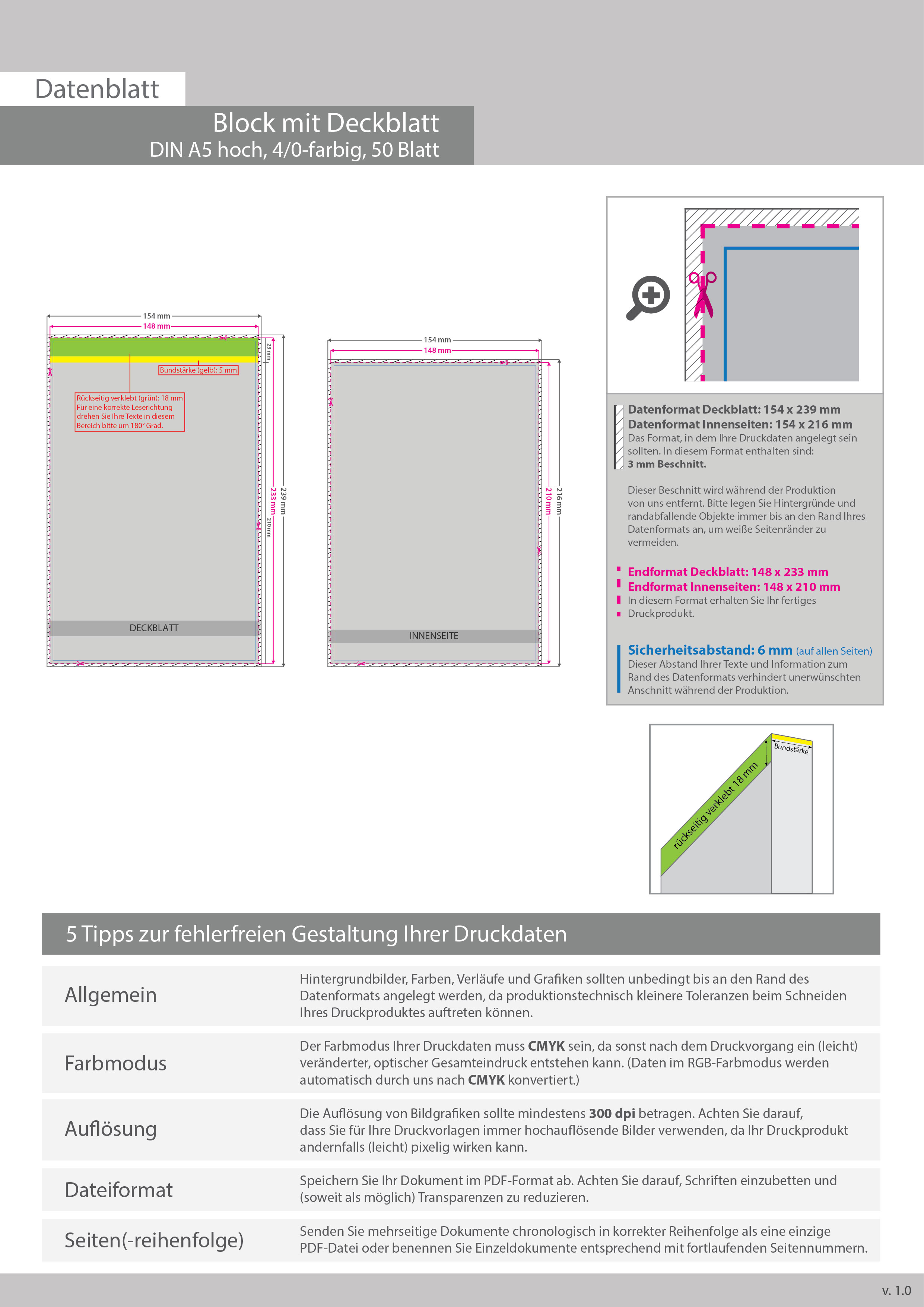 Block mit Leimbindung und Deckblatt, DIN A5, 50 Blatt, 4/0 farbig einseitig bedruckt