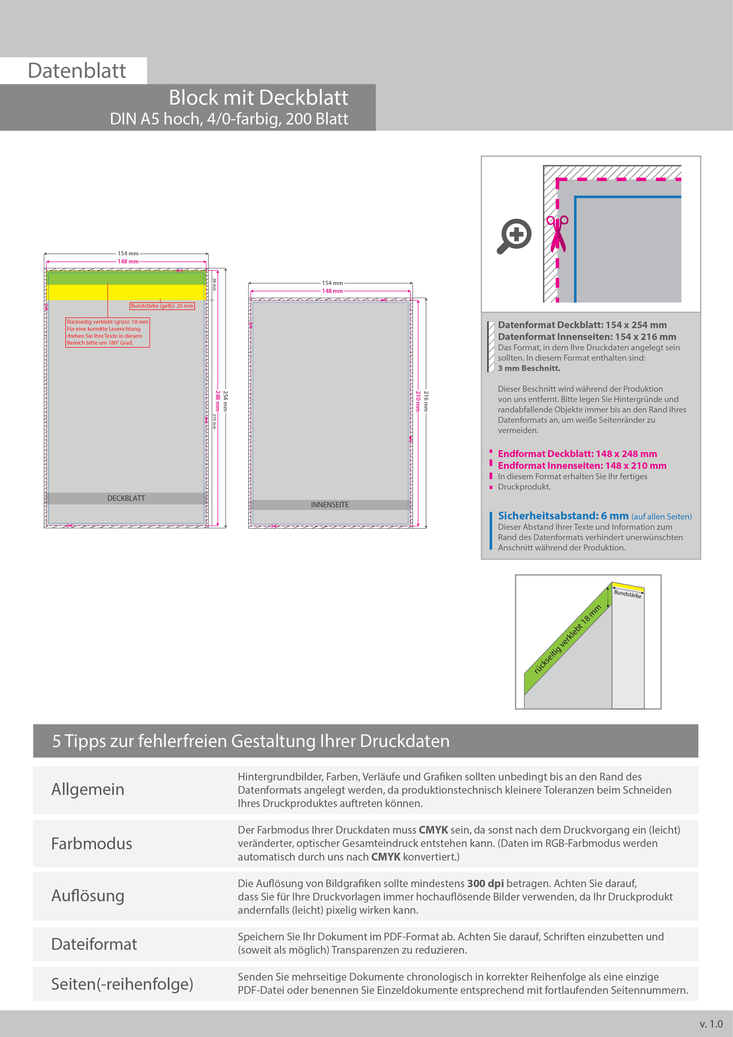 Block mit Leimbindung und Deckblatt, DIN A5, 200 Blatt, 4/0 farbig einseitig bedruckt