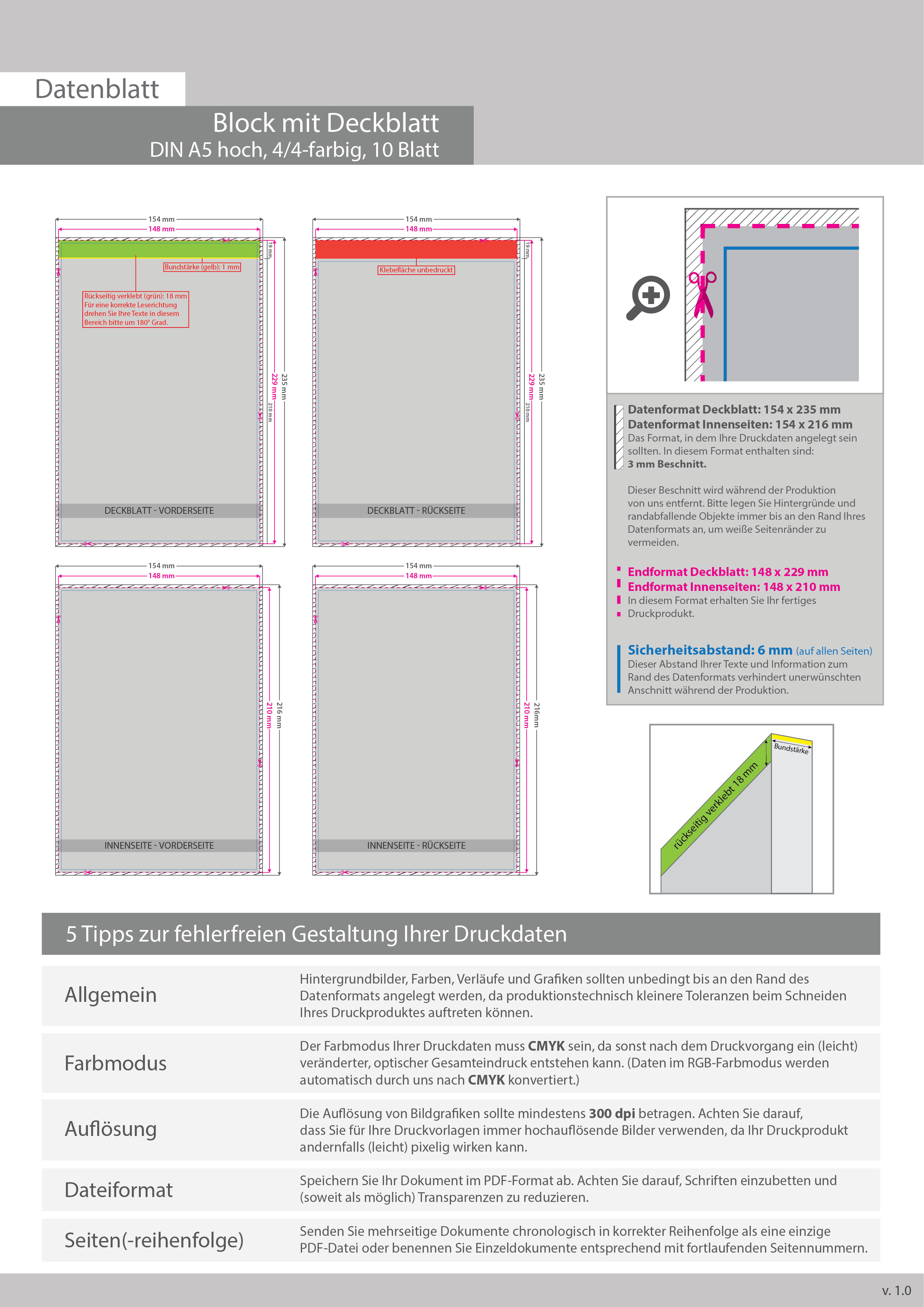 Block mit Leimbindung und Deckblatt, DIN A5, 10 Blatt, 4/4 farbig beidseitig bedruckt