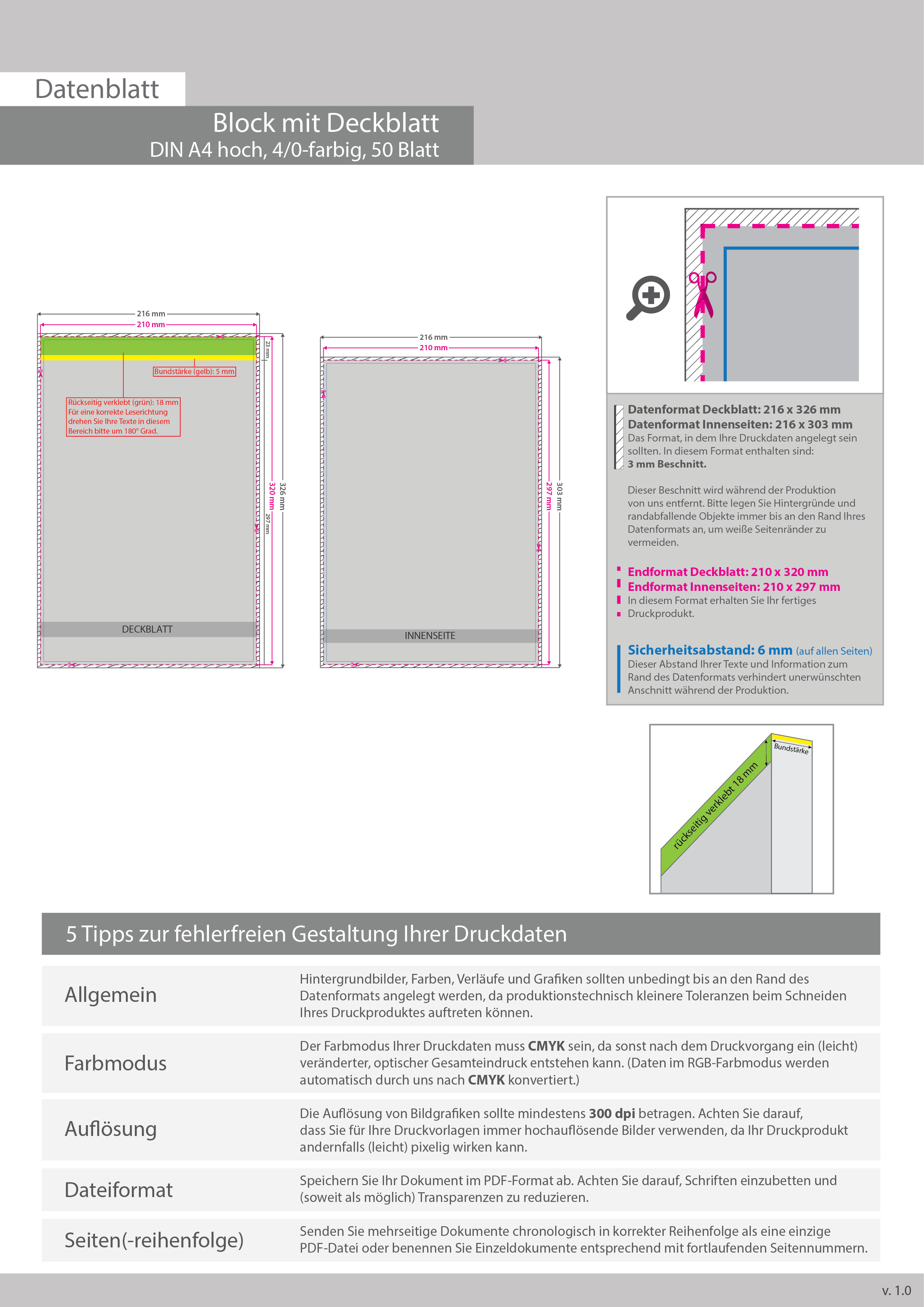 Block mit Leimbindung und Deckblatt, DIN A4, 50 Blatt, 4/0 farbig einseitig bedruckt