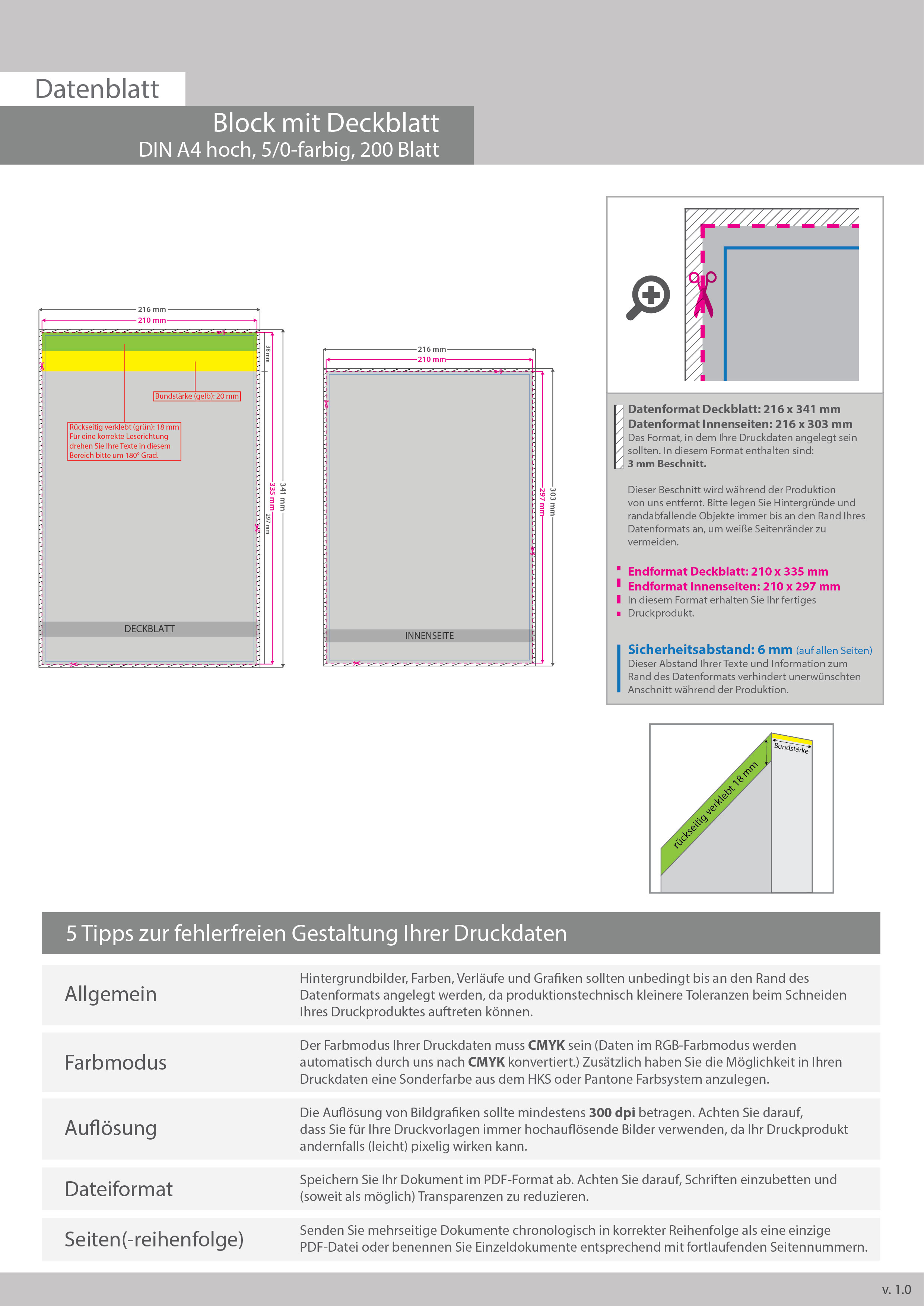 Block mit Leimbindung und Deckblatt, DIN A4, 200 Blatt, 5/0 farbig einseitig bedruckt (CMYK 4-farbig + 1 Sonderfarbe HKS oder Pantone)