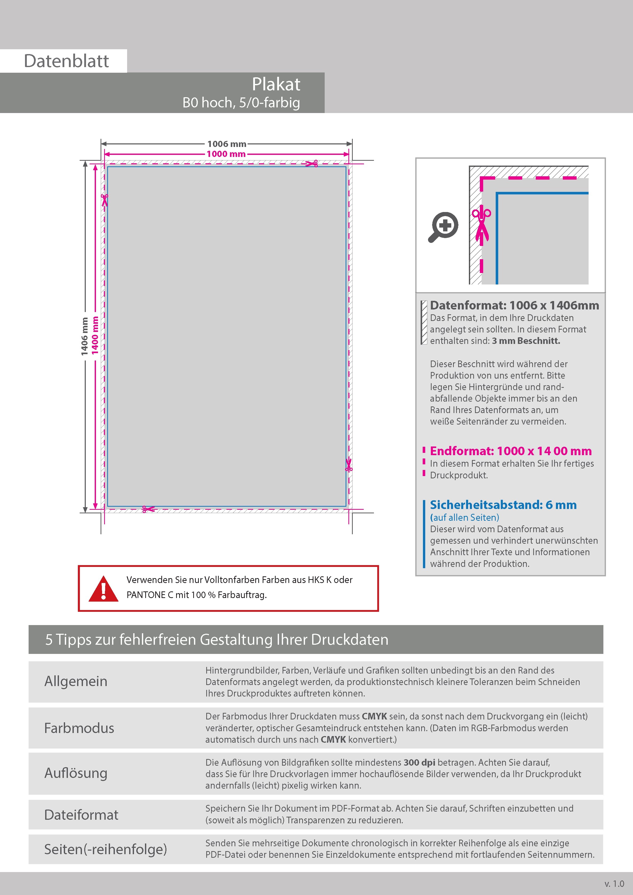 Plakat B0 hoch (1000 x 1400 mm) einseitig 5/0-farbig bedruckt (CMYK 4-farbig + 1 Sonderfarbe HKS oder Pantone)