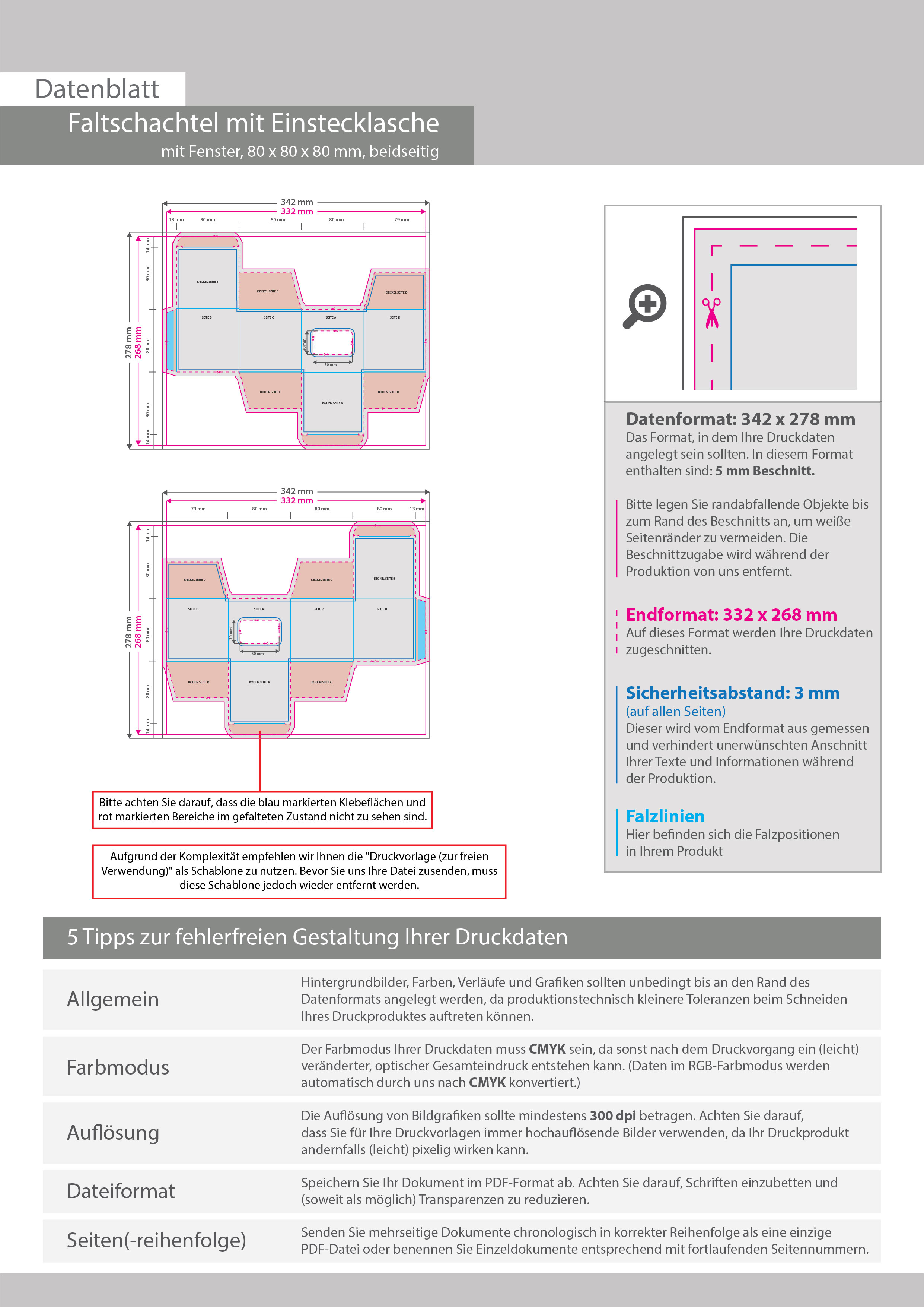 Faltschachtel (8 cm x 8 cm x 8 cm) beidseitig bedruckt 5/4-farbig (CMYK + Sonderfarbe) mit geklebtem Fenster
