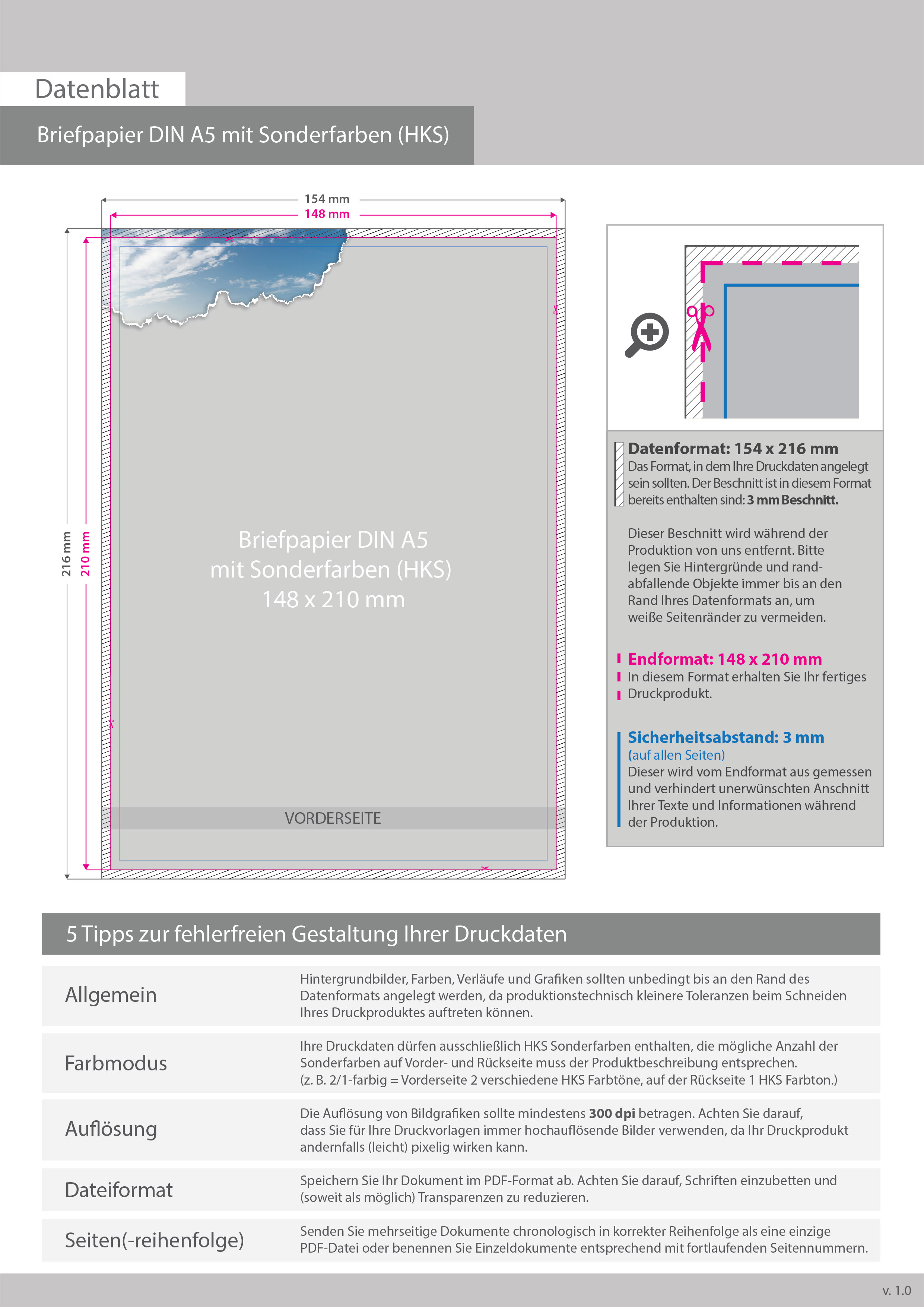 Briefpapier DIN A5, 4/0 farbig (Vorderseite: 4 Sonderfarben HKS / Rückseite: unbedruckt)